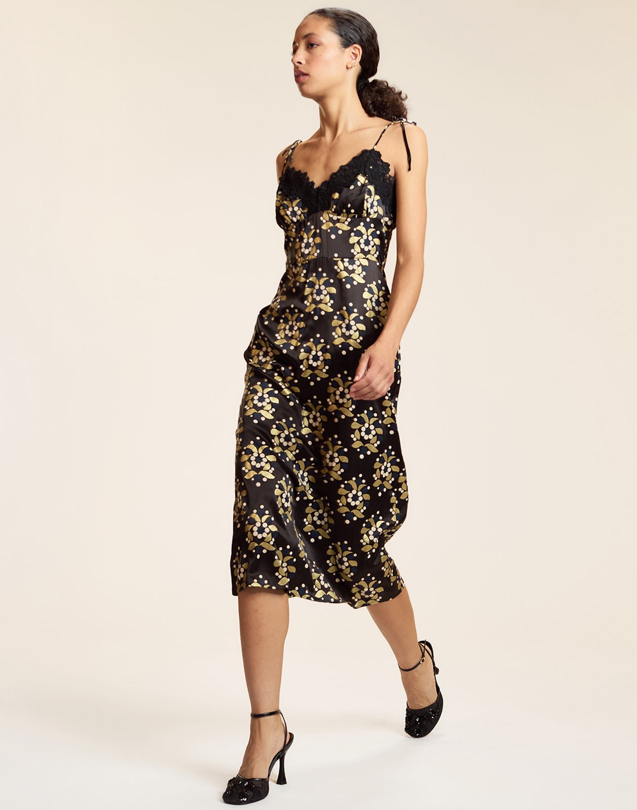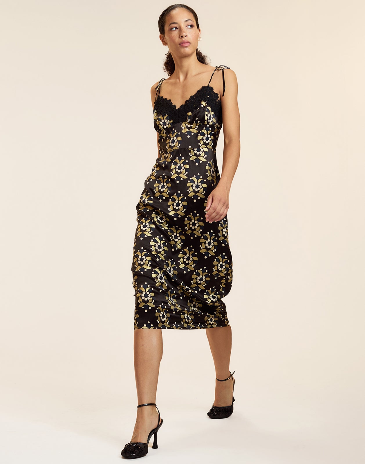 A silk midi dress adorned with a filigree-inspired print — delicate, lace-like patterns that feel both elegant and romantic.
