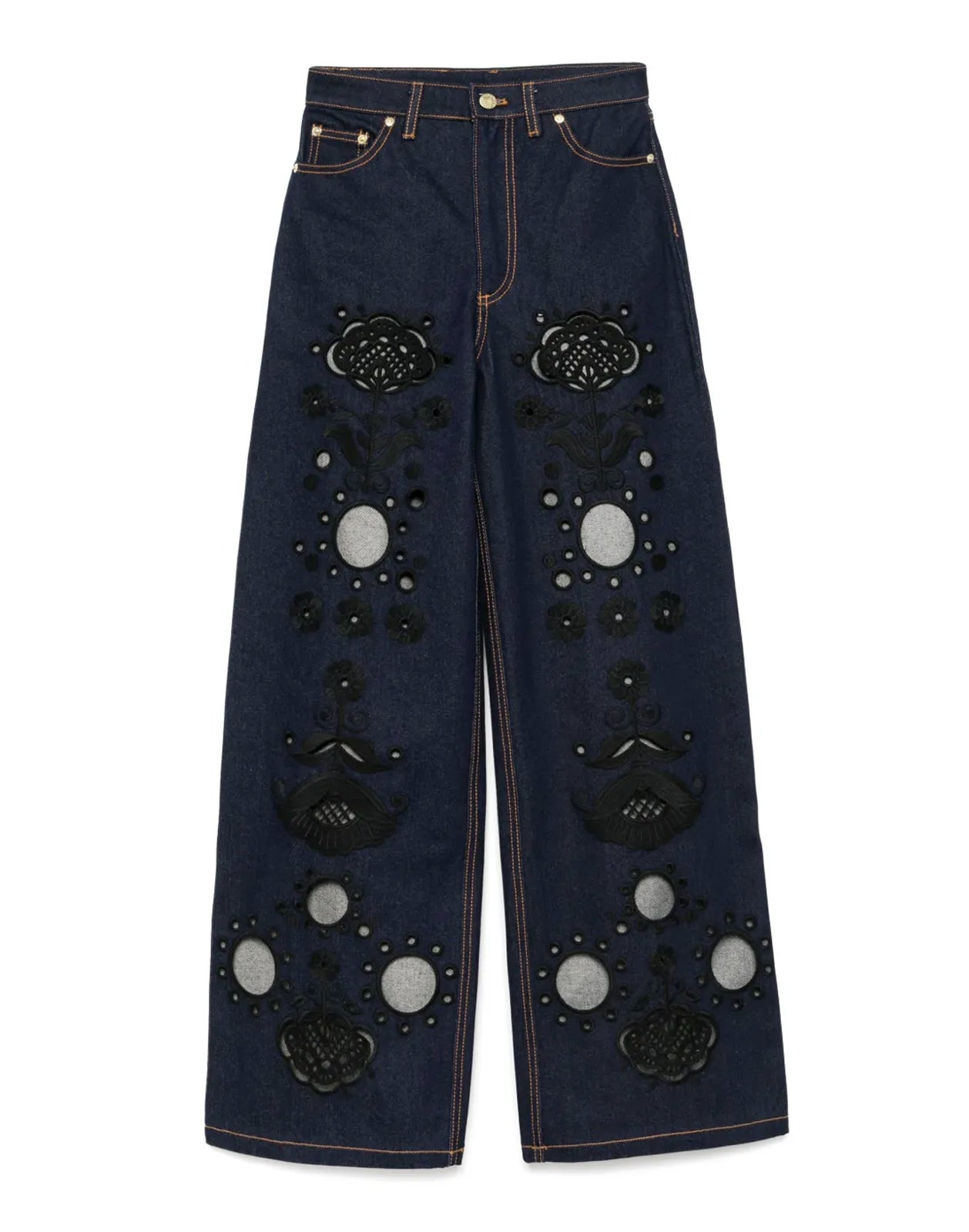 These high waisted wide-leg jeans bring major personality to your everyday denim. With bold floral embroidery and cutouts, these relaxed jeans are the perfect way to bring your denim collection to the next level. A classic 5 style pocket with incredible detailing makes them not only practical, but unique.