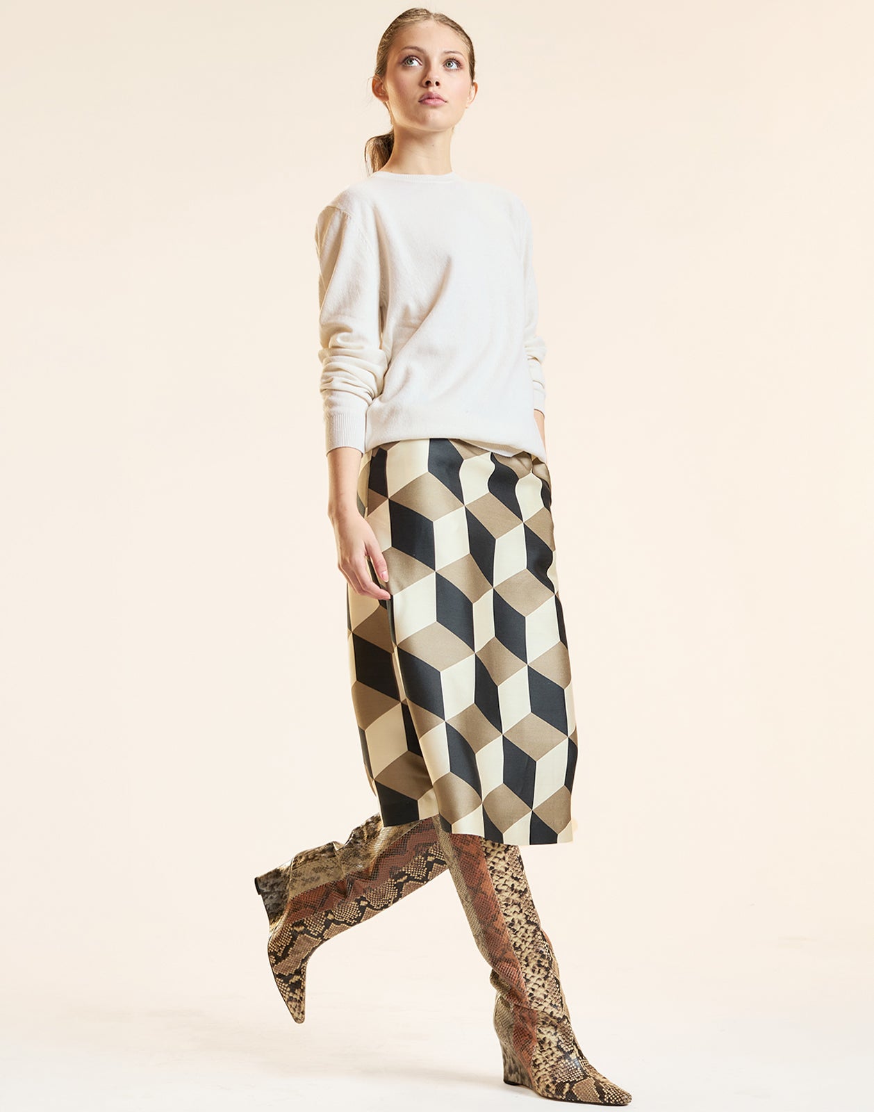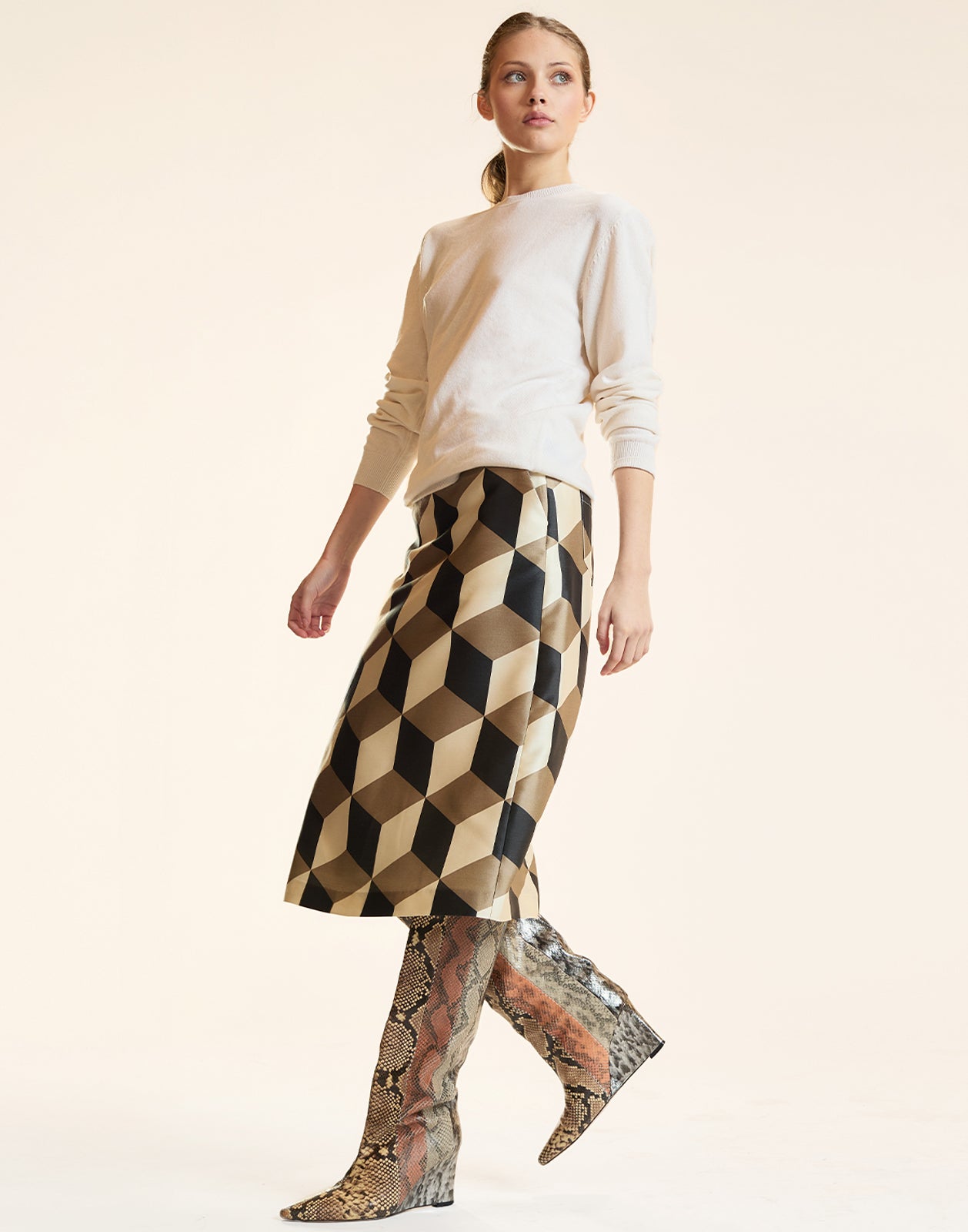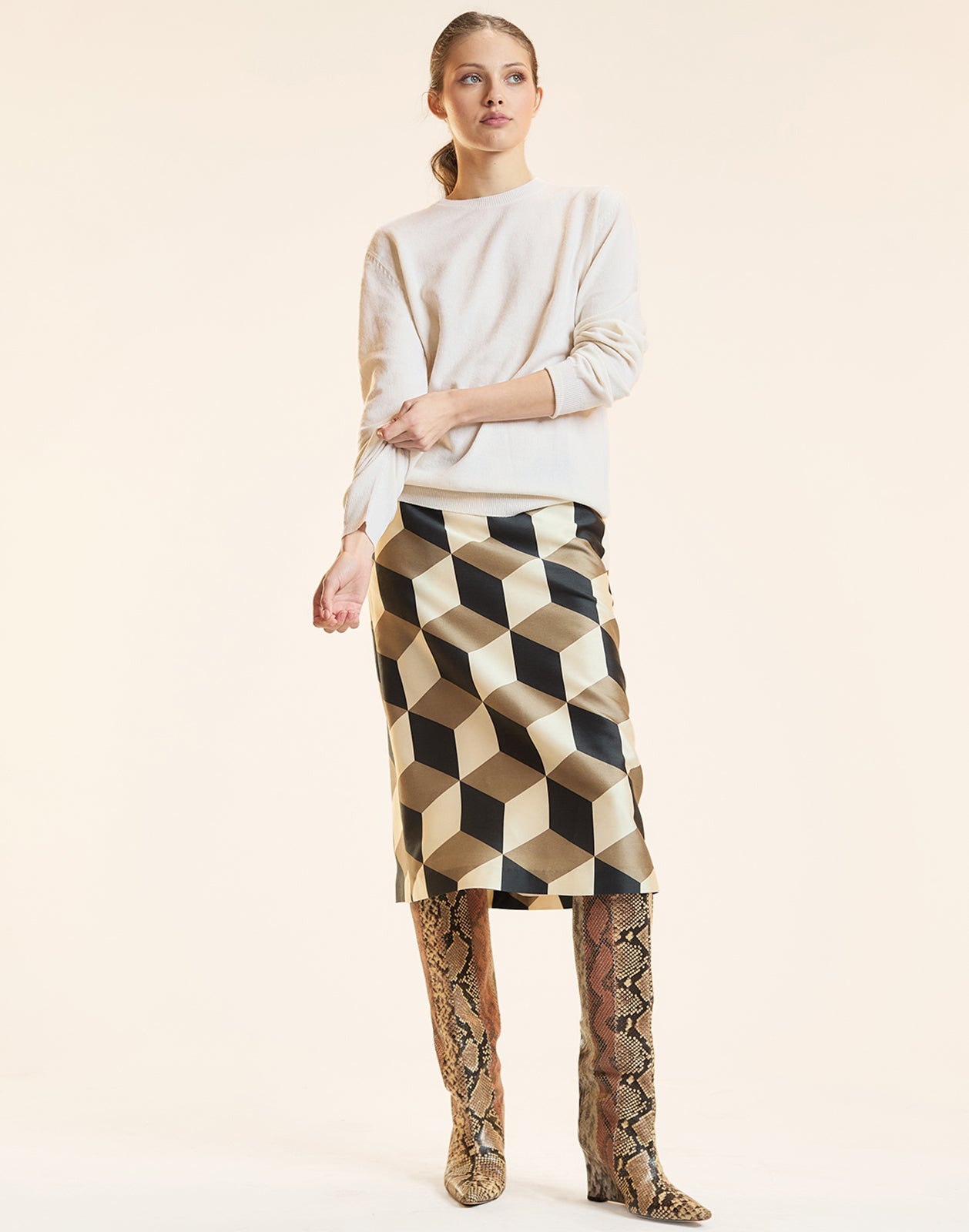 A sleek, modern midi skirt featuring a unique geometric pattern. Wear it with the matching top for a statement or style it with your favorite basic for an effortless look.