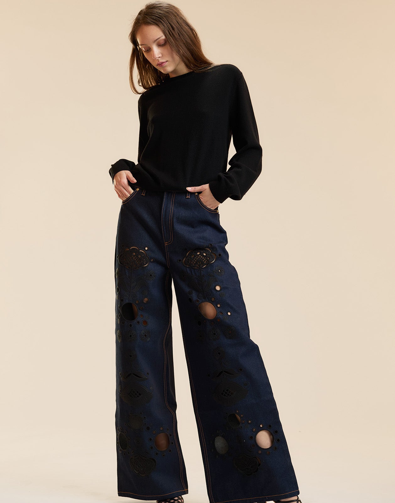 These high waisted wide-leg jeans bring major personality to your everyday denim. With bold floral embroidery and cutouts, these relaxed jeans are the perfect way to bring your denim collection to the next level. A classic 5 style pocket with incredible detailing makes them not only practical, but unique.