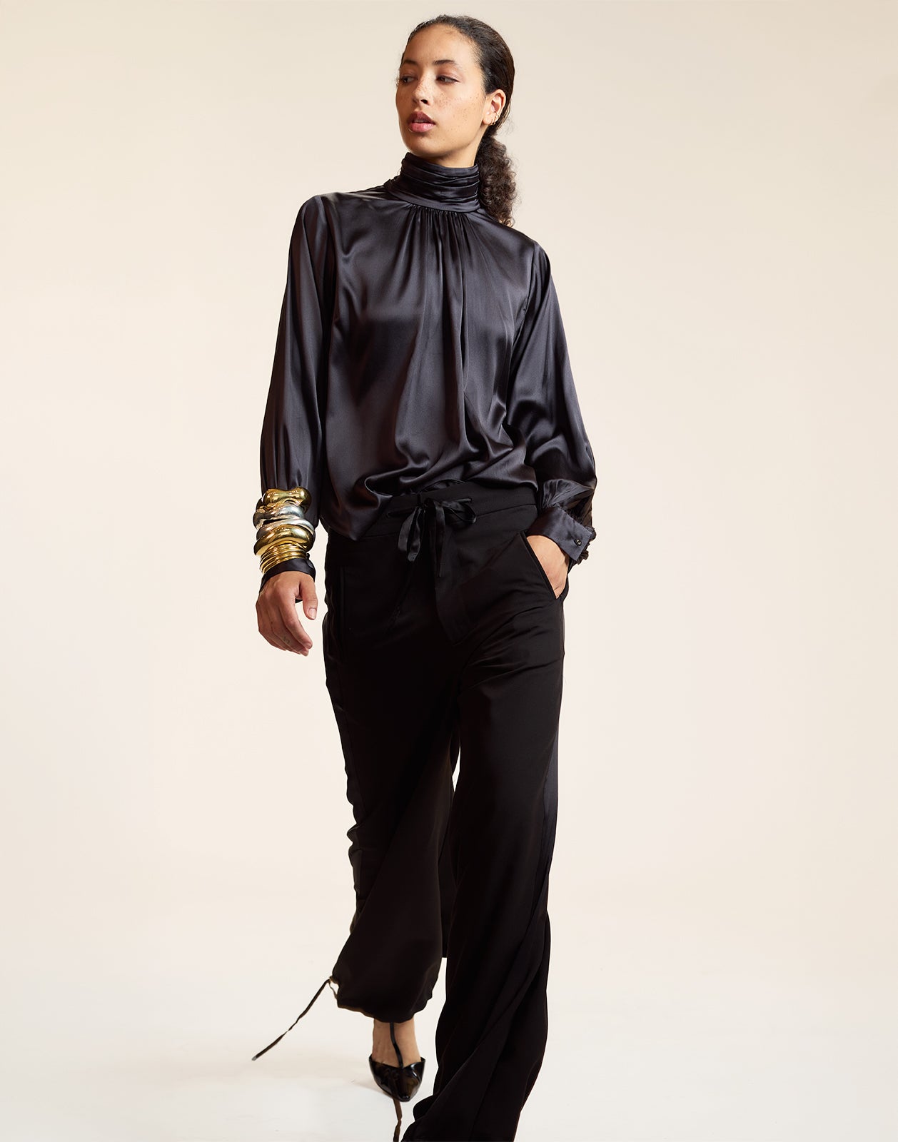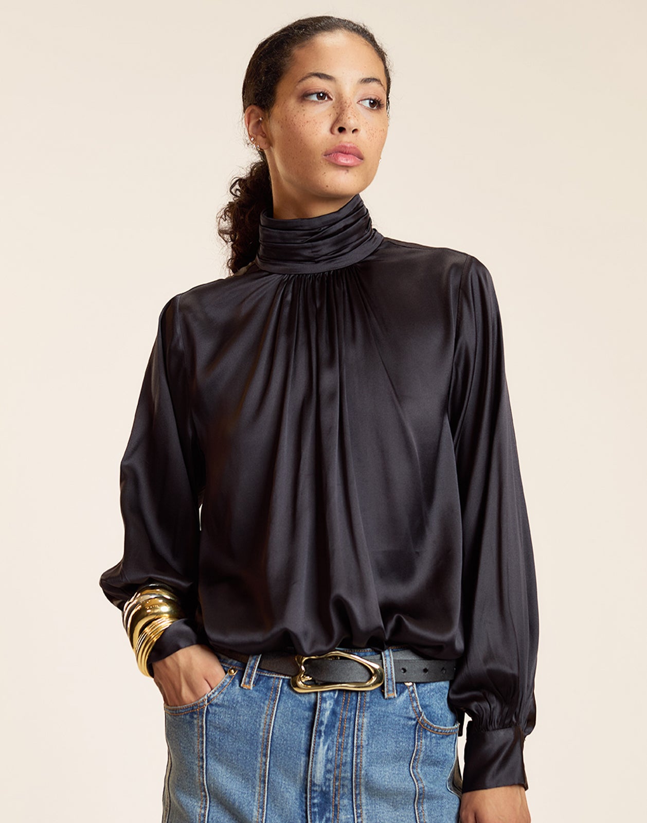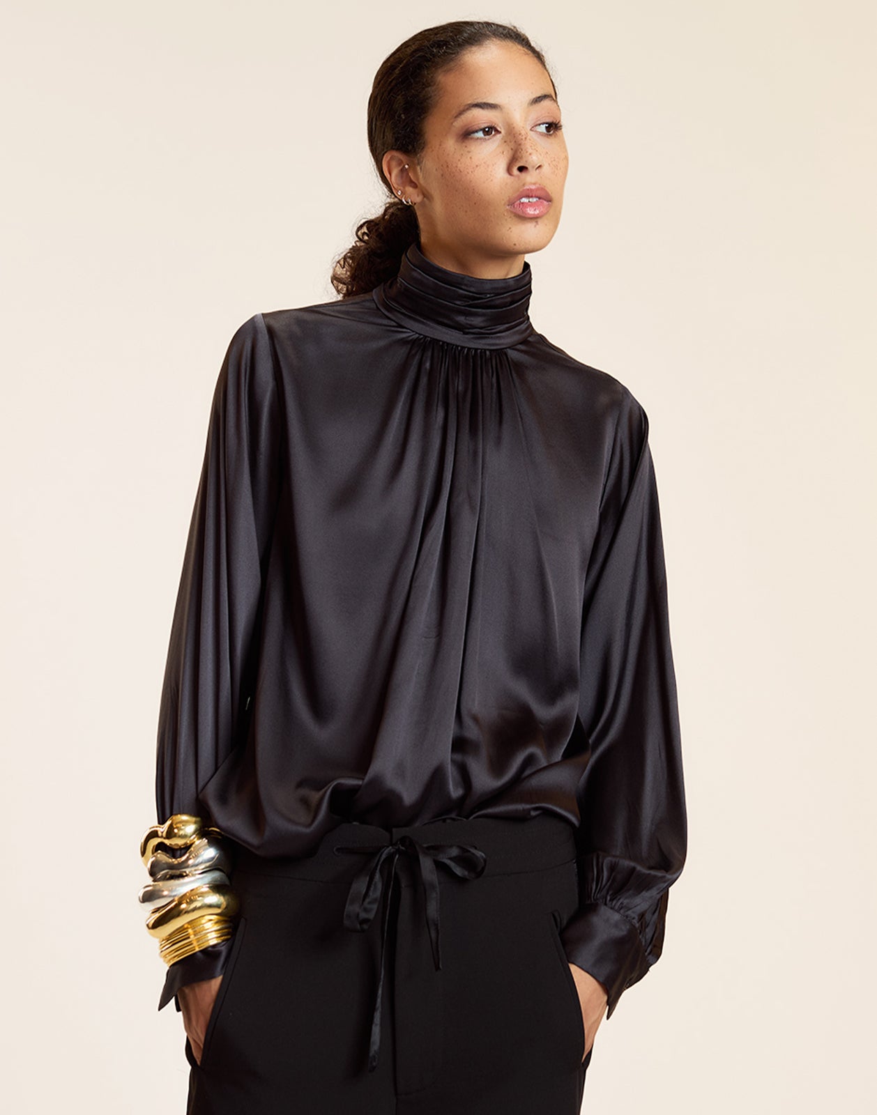 • Gathered high neckline